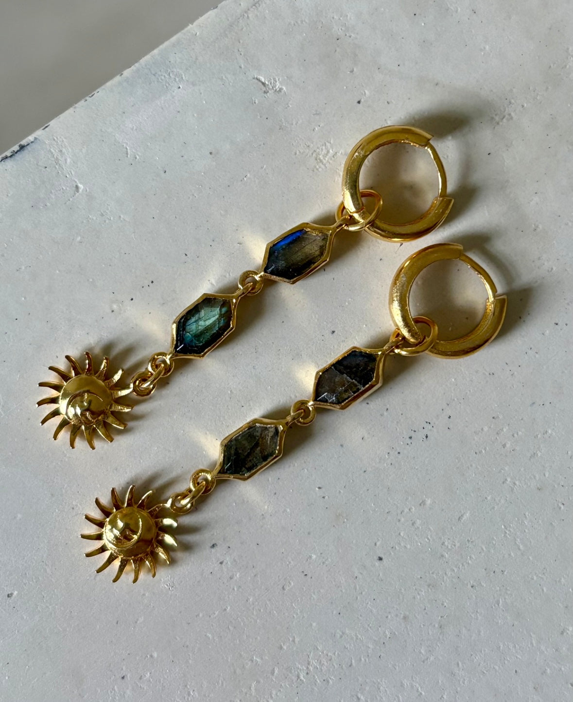 Caravana con argollitas gruesas, con piedras labradoritas y soles en las puntas.