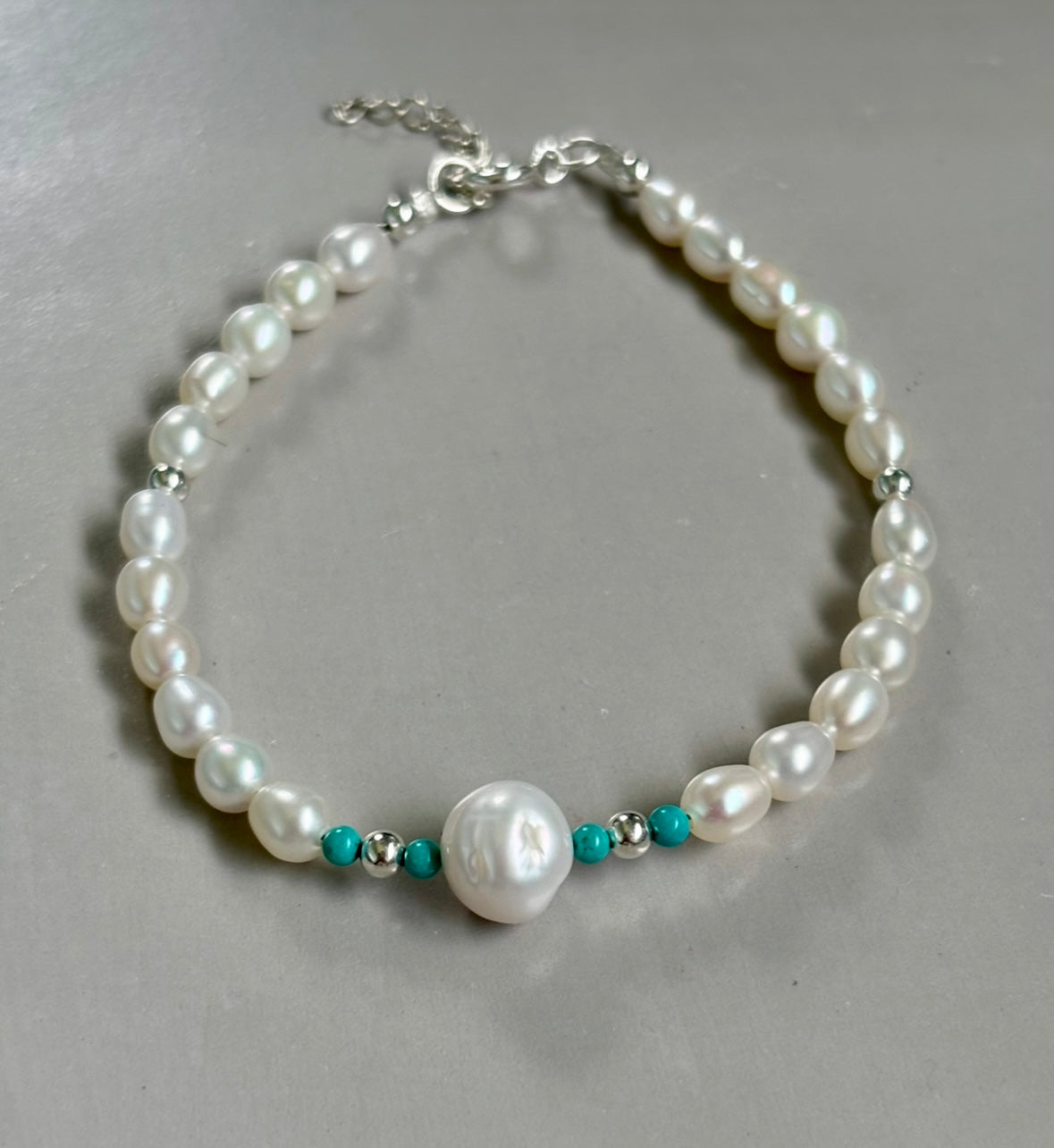 Pulsera hecha en plata con perlas naturales, piedra turquesa y pelotitas de plata.